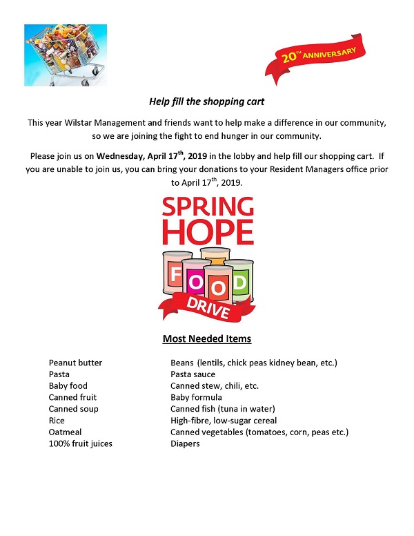Please join us on Wednesday, April 17th, 2019 in the lobby and help fill our shopping cart. If you are unable to join us, you can bring your donations to your Resident Managers office prior to April 17th, 2019.